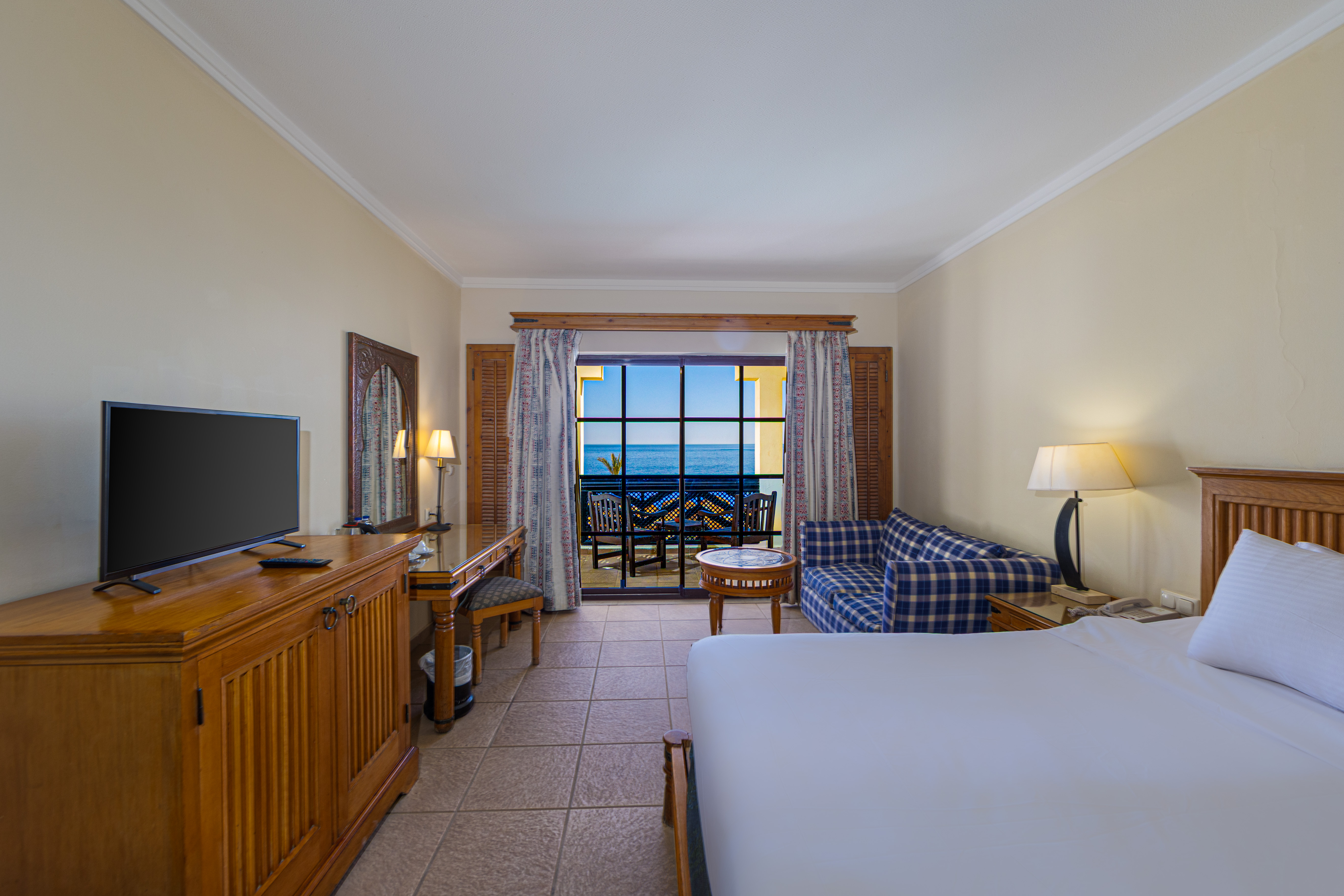 STANDARD ROOMS have a balcony or terrace and sleep up to 3 adults (with rollaway bed). Rooms without a balcony are available for a small reduction. POOL VIEW, SEA VIEW and INTER-CONNECTING ROOMS available at a supplement. All rooms have king or twin beds, bath or shower, WC, hair dryer, air conditioning (seasonal), safe, telephone*, satellite TV and mini-bar*.